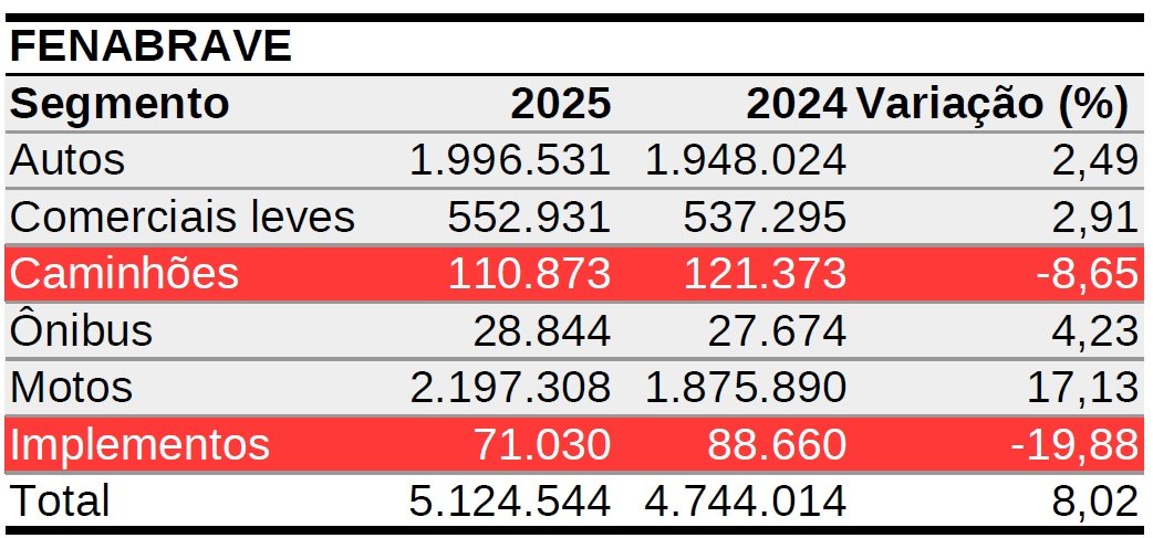 Por meio da assessoria de imprensa, o presidente da Fenabrave, Arcelio Junior, avaliou que o desempenho negativo dos caminhões reflete a forte dependência do setor em relação ao crescimento econômico e às condições de crédito.