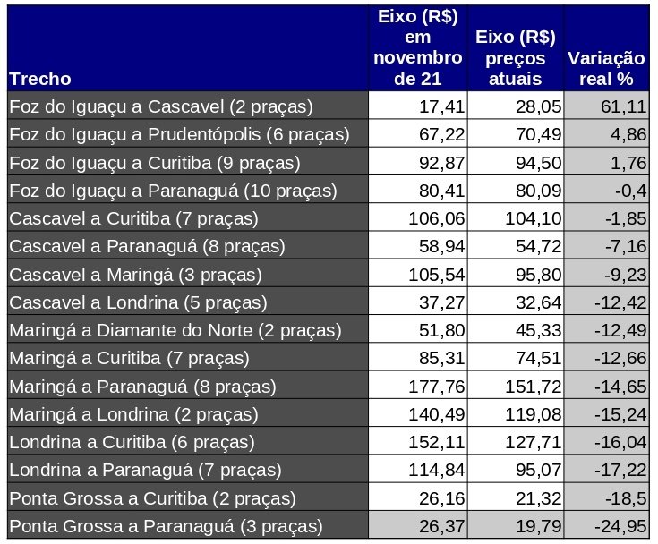 As reduções variam de 0,4% na viagem entre Foz do Iguaçu e Paranaguá — onde o custo por eixo por quilômetro caiu de R$ 80,41 para R$ 80,09 — até 24,95% no trecho entre Ponta Grossa e Paranaguá, com queda de R$ 26,37 para R$ 19,79 por eixo/km.