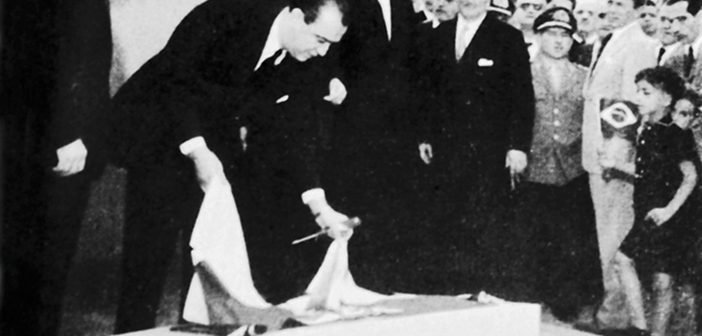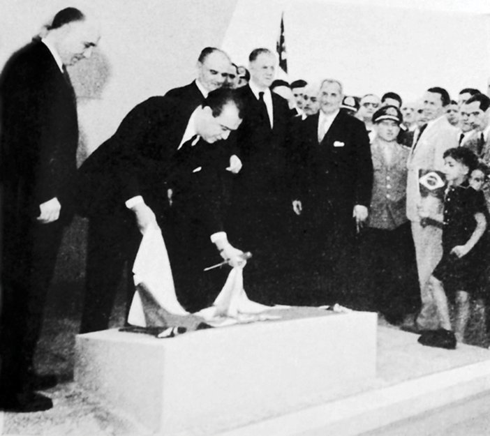 A partir da esquerda, Lúcio Meira, ministro da Viação e Obras Públicas; presidente JK; governador Bias Fortes; senador Benedito Valadares; e Edmundo Regis Bittencourt, diretor-geral do DNER: a Fernão Dias não estava pronta