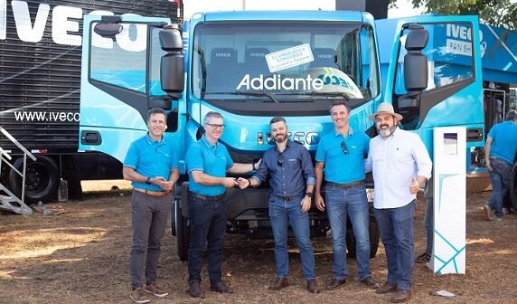 Na foto em destaque de Harak Yeda estão: Carlos Tavares, diretor Comercial da IVECO, Marcio Querichelli, presidente da IVECO para América Latina, Fabio Leite, CEO da Addiante, George Carloto, gerente de Vendas Corporativas e Vendas ao Governo da IVECO e Daniel Machado dos Santos, COO da Addiante