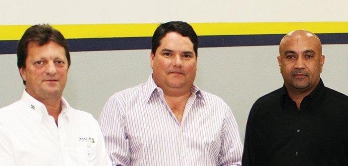 Manuel Dresch (esq.) com Túlio e Ramon, da Vitória Pneus: sistema patenteado