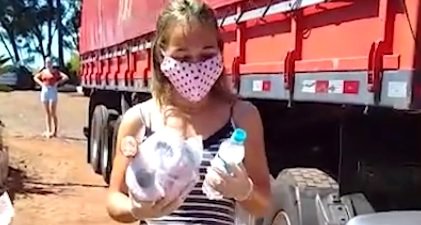 O casal de caminhoneiros Marlene e Eliseu Heinen ganhou um kit com papel higiênico, água, sabonete e marmitex em Capanema (PR).