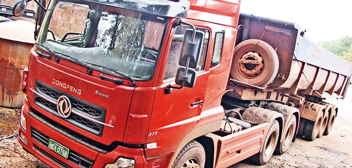 Uma das crias da Dong Feng esteve na frota da VIC Transporte, de Contagem, puxando bitrem, e agora roda nas mãos da Middle Logística, levando minério em caçamba de três eixos da Rossetti, em Congonhas.
