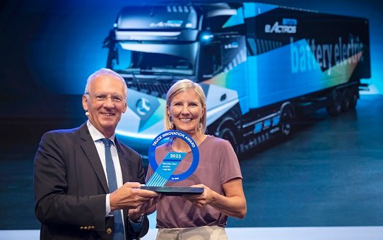 O caminhão eActros LongHaul da Mercedes-Benz venceu o Prêmio “2023 Truck Innovation Award”, premiação que é concedida para caminhões inovadores, na feira IAA Transportation 2022. Os veículos são avaliados pelo júri “International Truck of the Year” (IToY), composto por 25 jornalistas experientes de veículos comerciais de importantes meios de comunicação internacionais da Europa e de outros países. O conceito tecnológico global e inovador da tecnologia de bateria LFP do produto foi decisivo para a votação, assim como o novo eixo elétrico e a alta velocidade de desenvolvimento da Mercedes-Benz Trucks. Karin Rådström, CEO da Mercedes-Benz Trucks, recebeu o prêmio na noite do dia 19 de setembro, das mãos de Gianenrico Griffini, presidente do júri IToY.