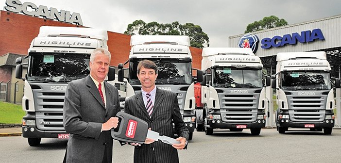 Christopher Podgorski, da Scania, entrega a chave a Osni Roman, da Fabet
