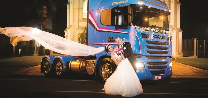 Com esse segundo veículo, o empresário levou a filha para se casar na igreja menos de um mês depois, em 11 de novembro. Os caminhões Scania serviram de inspiração para a festa. O sapato da noiva ganhou pintura especial na cor do primeiro 113 da família. As alianças foram levadas para o altar dentro de uma miniatura do veículo. O bolo também foi personalizado com a imagem do 113, assim como os canecos de chope, que ganharam caricatura dos noivos com o Scania. “Quando meu pai comprou o primeiro caminhão, eu tinha 6 anos de idade. Cresci viajando e aprendendo com ele que a gente tem de ter amor pelo que faz”, explica Cristiane.