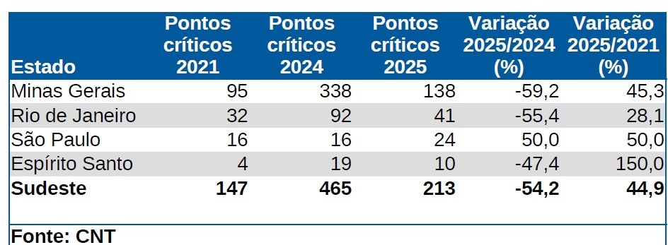 No recorte regional, a CNT contabilizou 213 pontos críticos nos quatro estados do Sudeste em 2025, o que representa uma redução de 54% em relação a 2024. Ainda assim, na comparação com 2021, a região apresenta piora de 45%, evidenciando a oscilação das condições de infraestrutura ao longo dos últimos anos.