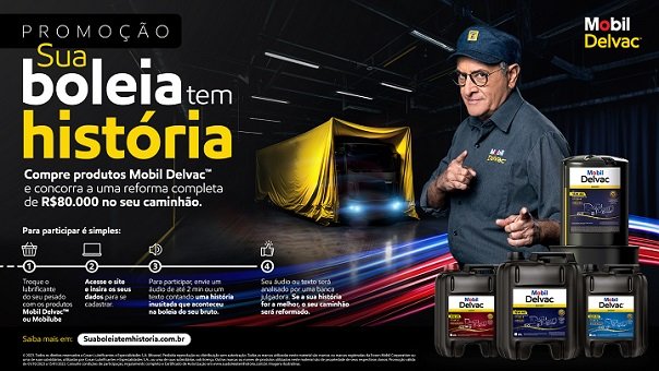 De 1º de outubro até 31 de dezembro, os lubrificantes Mobil lançam um concurso cultural para homenagear os caminhoneiros do Brasil. Sob o nome “Sua Boleia Tem História”, a promoção convida os caminhoneiros a compartilhar suas histórias inusitadas e emocionantes vivenciadas durante suas viagens. Em jogo está uma premiação incrível: uma reforma completa do caminhão no valor de R$80.000,00.