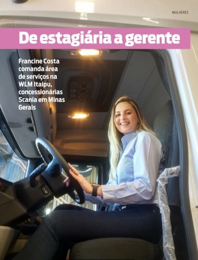 A gerente-geral de Serviços da WLM Itaipu (grupo de concessionárias Scania), Francine Costa, é destaque da página de Mulheres da nova edição digital da Revista Carga Pesada. Clique aqui para ler.