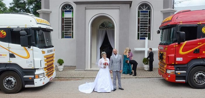 CASAMENTO – Depois de cinco anos de relacionamento, Sharon e Ricardo se casaram no último dia 20 de outubro. Foram para a igreja dirigindo os caminhões da Rodoseni que pilotam. “Antes de ir para a cerimônia, fui me vestir na casa do padrinho. O chão era de brita. Estava muito nervosa. Na hora de sair, o caminhão ficou patinando. Precisou chegar um colega e me lembrar de ligar o bloqueio”, conta.