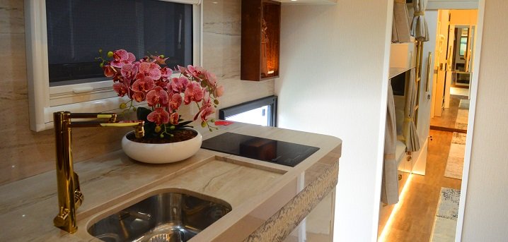 · Na parte dianteira do motorhome: um apartamento para 5 pessoas, sendo um triliche mais um beliche de solteiro, todos com TV para cada ocupante, ar condicionado, armários, banheiro completo, com ducha sofisticada, vaso sanitário e aquecedor de toalhas.