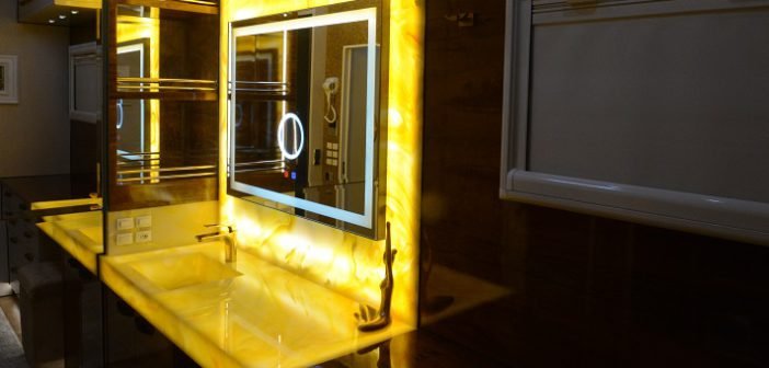 · Um camarim, com bancadas em pedra luminosa, espelho inteligente e armários.